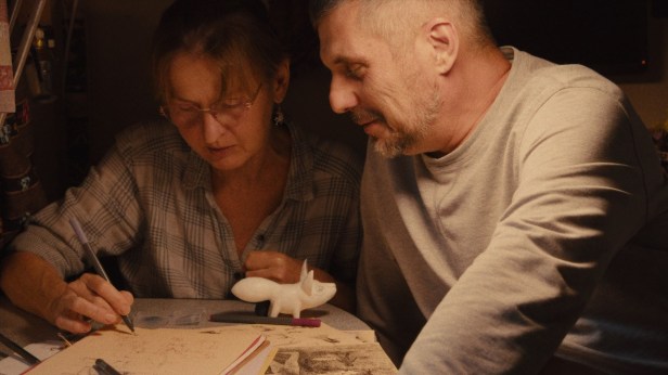 The porcelain figurines of Slava and Anya, snails, reptiles, and owls covered in sometimes animated painted scenes from folklore and from the artist’s imagination Anya, are beautiful and amusing. But I wanted to see more of the darkness conjured in Andrey’s art by the war and displacement of his family. At one point, he laments that a year and a half of their lives has been “ripped out by the war.” Andrey is also the cinematographer of the film, and his images show us the stark contrast between the natural beauty surrounding Kharkiv and the wholesale destruction of the rubble-covered city under constant bombardment from Russia. Even in the surrounding woodlands and wetlands, you feel that the bucolic adventures of the artists could be interrupted at any moment by Russian enemy soldiers. In one scene, Slava and Anya go mushroom hunting, and suddenly, Salva asks Anya to pick Frodo up. They have stumbled upon a minefield in the wild. One is reminded of Otto Dix, the German artist whose hallucinatory, nightmarish portraits of WWI trench warfare were condemned by the war-mongering Nazis as “degenerate art.” That would hardly be the case for Slava and Anya’s whimsical beasts. But the beasts do argue that all art created by victims of aggression is somehow political.